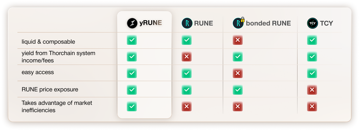Yield Bearing RUNE (yRUNE) is an auto-rebalancing basket of RUNE and TCY. Since no liquid-staked version of RUNE currently exists, yRUNE is the only liquid asset that captures fees from THORChain system income (via staked TCY) while also providing exposure to the RUNE price.